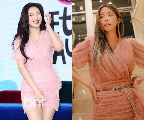 Mẫu váy Pink Tulle Wrap Mini của Johnny Hates Jazz đem đến cho Joy (Red Velvet) vẻ ngọt ngào nữ tính. Còn Heize lại biến tấu kết hợp thêm thắt lưng đính kim loại, cùng lối trang điểm đầy cá tính.