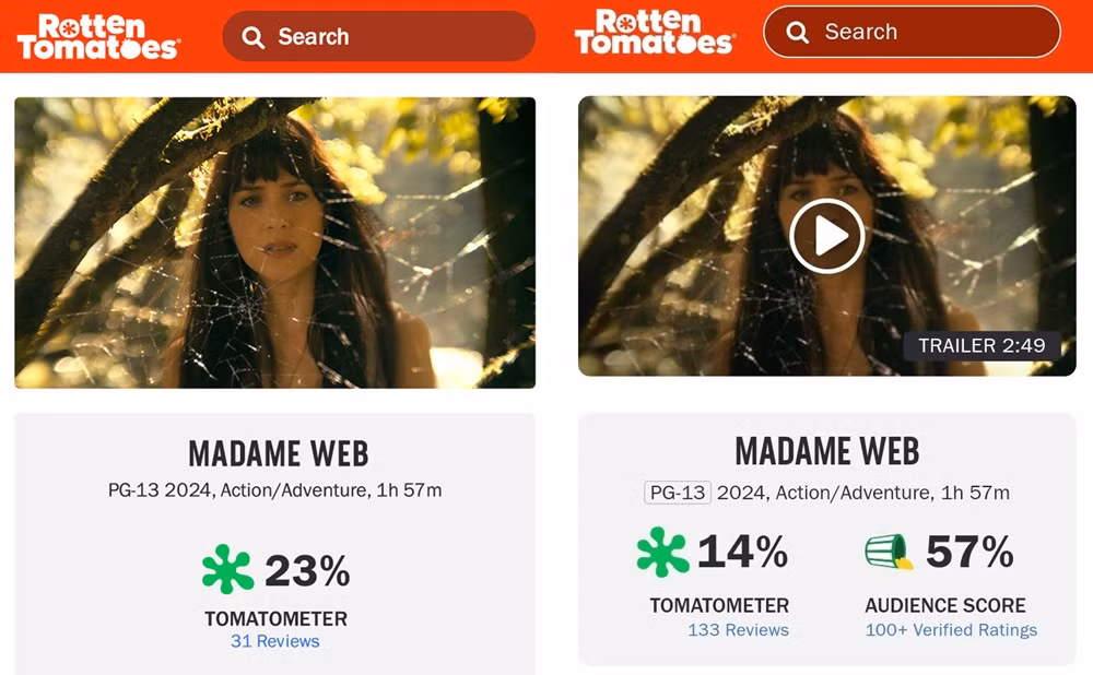 Vừa mới ra mắt nhưng Madame Web - bộ phim thứ tư trong Vũ trụ Người Nhện của Sony - đã sớm được nhận định là một trong những phim siêu anh hùng tệ nhất năm 2024 nói riêng, và mặt bằng phim siêu anh hùng nói chung. Từ nội dung đến kỹ xảo, Madame Web không vớt được điểm cộng nào. Điểm mở đầu của Madame Web trên trang Rotten Tomatoes vốn đã thấp với 23%, nhưng tụt dần đều chỉ còn 14% và vẫn đang có dấu hiệu tiếp tục giảm.