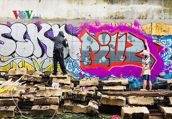 Graffiti là 1 môn nghệ thuật đường phố trong đó các nghệ sĩ này thường chọn các mảng tường ở nơi công cộng để thể hiện "khả năng" của mình, tuy nhiên việc làm này cũng bị phê phán là làm bẩn phố phường. Trong ảnh: 2 thanh niên người nước ngoài đang vẽ Graffiti lên 1 bức tường ven đường tàu trên phố Trần Phú...