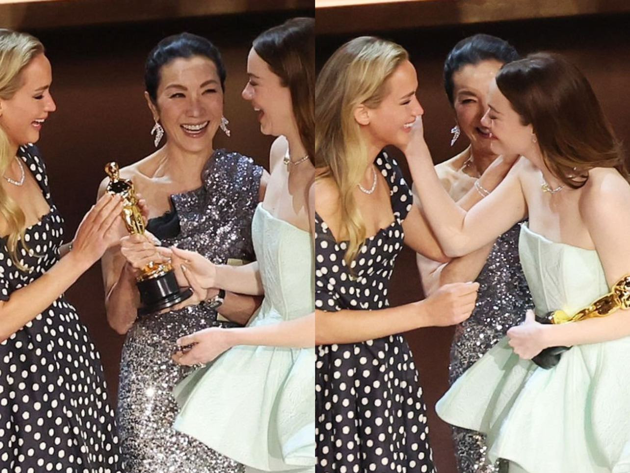 | Jennifer Lawrence lấy tượng Oscar từ Dương Tử Quỳnh rồi dúi vào tay Emma Stone dù cô không phải là người trao cúp chính. Nguồn: ABC News |