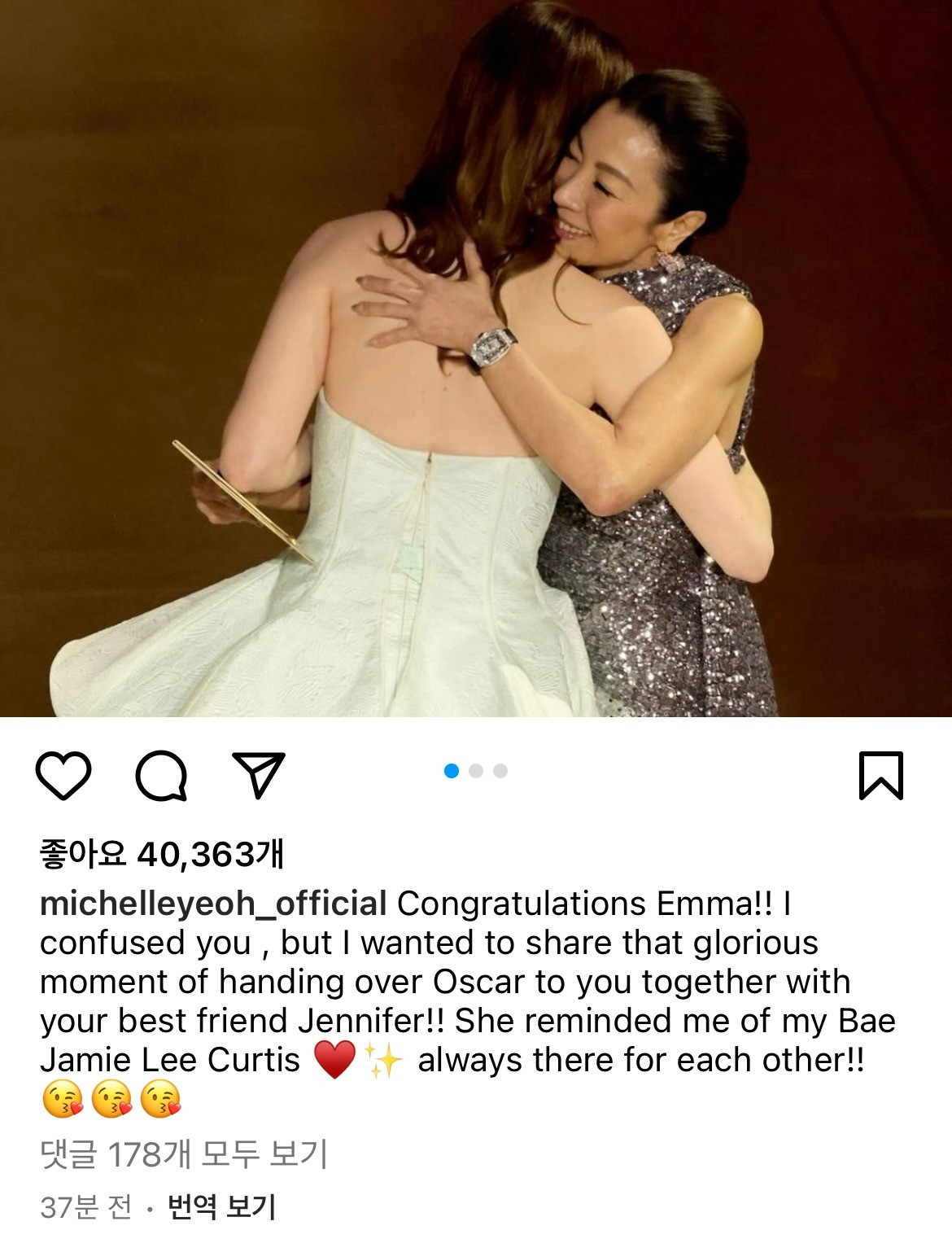 "Chúc mừng em, Emma! Chúng ta đã có một chút bối rối trên sân khấu nhưng tôi muốn chia sẻ khoảnh khắc vinh quang đó khi trao giải Oscar cho bạn cùng với người bạn thân nhất của bạn, Jennifer (Jennifer Lawrence)!! Hai bạn khiến tôi nhớ lại khoảnh khắc giữa tôi và bạn thân, Jamie Lee Curtis - những người bạn thân luôn ở cạnh nhau trong những giây phút như thế này!"