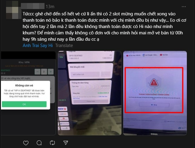 Một số khán giả đăng tải trên nền tảng Threads về sự bất cập trong khâu mua vé, cụ thể là thanh toán khi tham gia săn vé sớm concert Anh Trai "Say Hi" ngày 3. Có những người vào xếp hàng ở các số nhỏ, sớm, thậm chí trong số 100 đổ lại vẫn không thể săn được vé concert theo ý muốn.