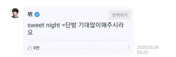 Các ARMY tất nhiên lại càng háo hức với điều này, đã lên mạng xã hội Weverse của các nghệ sĩ nhà Big Hit để chúc mừng ca khúc solo mới của V và tin rằng chắc chắn nó sẽ rất thành công. Thật không ngờ V đã để lại bình luận dưới bài đăng này, và lại còn viết rất khó hiểu rằng “sweet night = dan bam, các bạn hãy đón chờ ca khúc này nhé!".