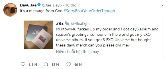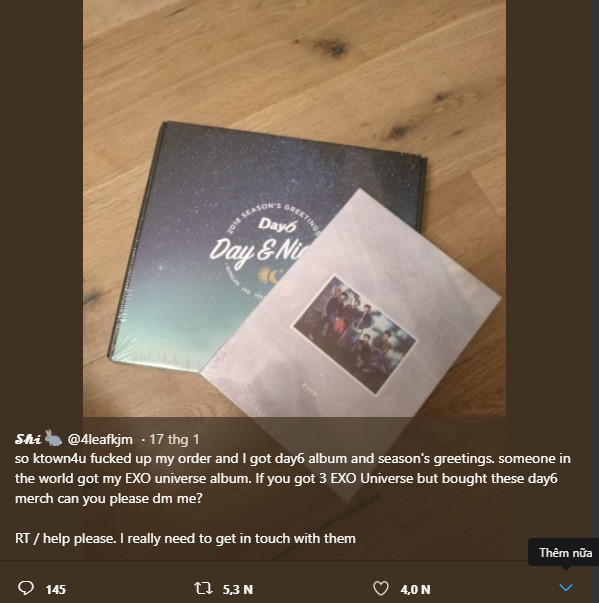 Người này viết: "ktown4u đã làm loạn đơn đặt hàng của tôi. Trong khi tôi nhận được album và season’s greetings của DAY6 thì ai đó trên thế giới này đã nhận được album EXO Universe của tôi. Nếu ai mua album DAY6 mà nhận được 3 album EXO thì hãy nhắn tin cho tôi nhé? Làm ơn hãy retweet giúp tôi. Tôi rất cần liên lạc với người đó”.