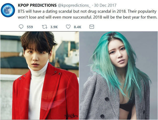 “Thánh tiên tri” cho rằng trong năm 2018, BTS không dính vụ ồn ào nào về chất gây nghiện nhưng sẽ có tin đồn hẹn hò. Và từ đầu năm đến giờ, đã có hai cặp đôi Suga - Suran cùng Jungkook - Yeri lên sóng.