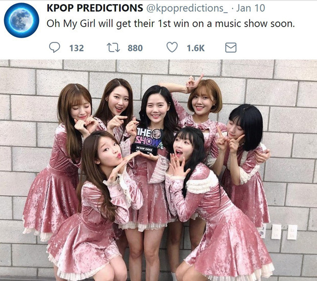 Phải chăng Kpop Predictions có khả năng đoán trước kết quả các chương trình âm nhạc, nên mới biết Oh My Girl lần đầu tiên giành cúp. Chính các cô gái còn không tin nổi vào điều này, nói gì đến khán giả.