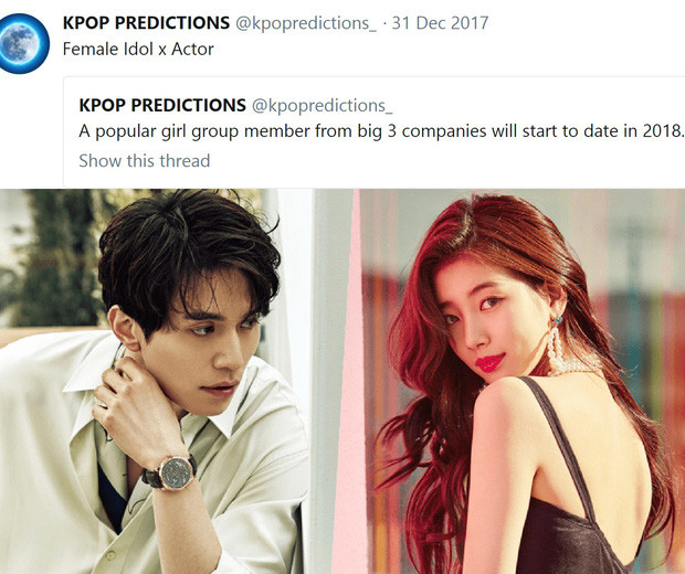 Cuối năm 2017, “thánh tiên tri K-Pop” khẳng định sẽ có một idol nữ nổi tiếng thuộc BIG3 hẹn hò với một nam diễn viên. Bạn có thấy trùng hợp với chuyện cặp đôi Suzy – Lee Dong Wook không?