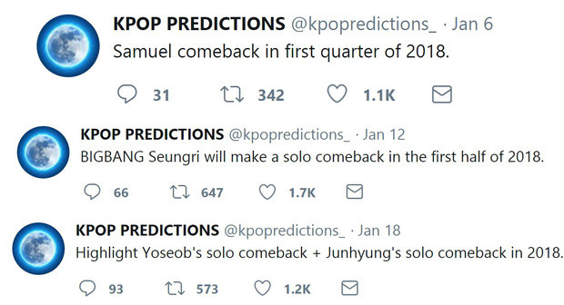 Lâu nay, fan K-Pop hết sức tò mò xen lẫn nể phục một tài khoản Twitter có tên Kpop Predictions, gọi nhân vật này là “thánh tiên tri K-Pop”. Lý do vì Kpop Predictions liên tục đưa ra các lời tiên đoán, và thường là chính xác. Chẳng hạn như từ đầu năm 2018 đến giờ, đã có 5 sự kiện được Kpop Predictions nhắc tới trước khi sự kiện chính thức xảy ra.