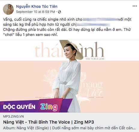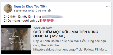 Cô học trò Lưu Hiền Trinh vừa "debut" bài mới cũng được Tóc Tiên nhanh chóng chia sẻ lên trang cá nhân của mình.