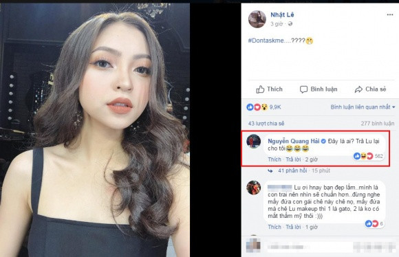 Mới đây, cô nàng thử thay đổi phong cách bằng việc bỏ đi cặp kính quen thuộc và trang điểm đậm. Bức ảnh ghi lại sự thay đổi này được cô đăng tải trên trang cá nhân của mình đã thu hút cộng đồng mạng. Đáng chú ý, là dòng bình luận đầy "hốt hoảng" của Quang Hải: "Đây là ai? Trả Lu lại cho tôi" (Lu là biệt danh đáng yêu của Nhật Lê).