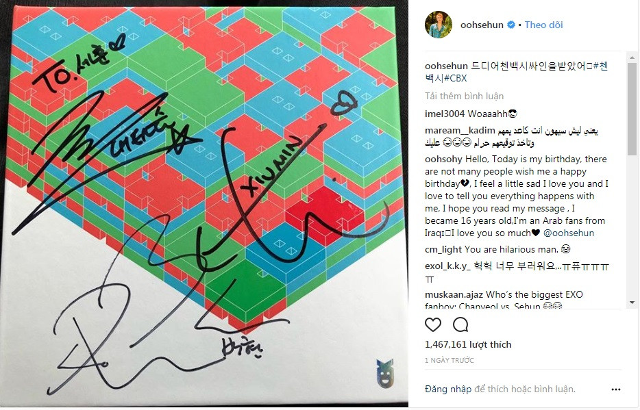 Và khi về nhà, Sehun đã không quên khoe chiến tích của mình lên Instagram. Đó chính là album Blooming Days có đủ chữ ký của EXO-CBX.