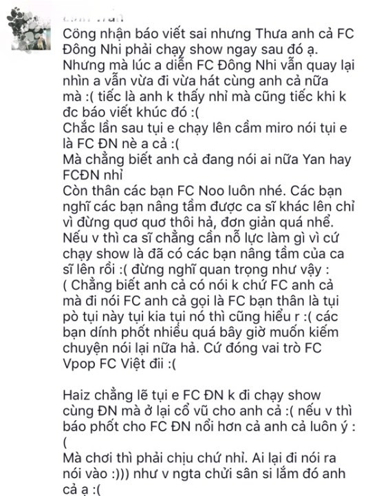Trong bài viết có đoạn mô tả như sau: "Đến lượt Noo Phước Thịnh trình diễn, FC của Đông Nhi vẫn ở lại chương trình để cổ vũ cho nam ca sĩ sinh năm 1988 (Noo Phước Thịnh)". Noo Phước Thịnh đã thể hiện quan điểm không đồng tình với chi tiết này và đặt câu hỏi: " Đâu? Y. (trang tin) có mặt ở đó không?".