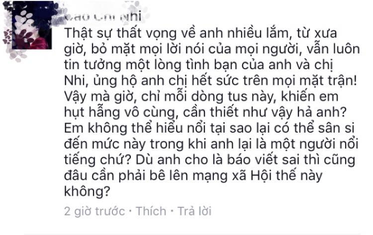 Dù chưa xác thực được dòng trạng thái này ám chỉ chuyện gì, thế những nhiều fan của Noo Phước Thịnh cho rằng nữ ca sĩ đang "đổ thêm dầu vào lửa". Các fan của Noo Phước Thịnh đã nhanh chóng bênh vực thần tượng trên Facebook được cho là của Đông Nhi. Nhiều chuyện "tiêu cực" trước đó cũng được đem ra tranh luận lại.