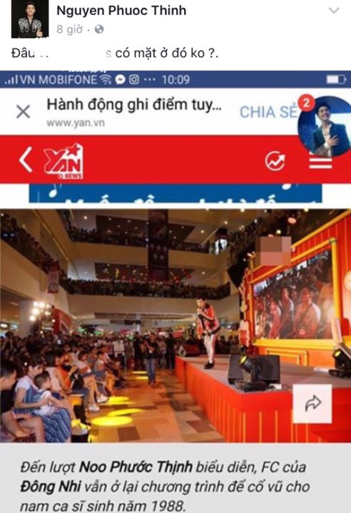 Cách đây ít giờ, nam ca sĩ Noo Phước Thịnh bất ngờ chia sẻ dòng trạng thái bày tỏ sự không hài lòng của anh với thông tin do một trang tin điện tử đưa ra. Theo đó, bài viết này đưa tin về một chương trình có sự góp mặt gần đây của Noo Phước Thịnh, Đông Nhi,... diễn ra vào tối Chủ Nhật 30/7 tại trung tâm thương mại Vivo City (TP.HCM).