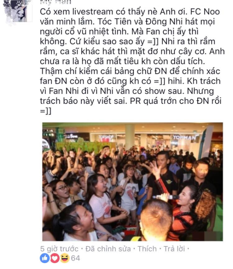 Ngay lập tức, người hâm mộ của Noo Phước Thịnh cũng bày tỏ sự khó chịu với bài viết. Một số ý kiến bình luận trên dòng trạng thái của Noo Phước Thịnh cho rằng đây là hành động thiếu tôn trọng nam ca sĩ, mượn tên Noo Phước Thịnh để tâng bốc fan Đông Nhi.