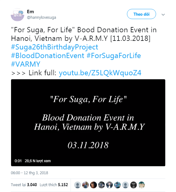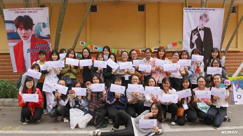 Chương trình hiến máu tình nguyện For Suga, For Life đã được diễn ra vào ngày 11/3/2018, với sự hợp tác của bệnh viện Việt Đức và Hội chữ thập đỏ quận Long Biên. Chương trình có sự góp mặt của hơn 300 người hâm mộ BTS đến từ nhiều tỉnh thành trong cả nước. Kết thúc sự kiện, gần 200 đơn vị máu đã được đóng góp vào quỹ máu phục vụ điều trị của bệnh viện Việt Đức. Cho tới hiện tại, đây là chương trình hiến máu thu được số đơn vị máu lớn nhất của cộng đồng người hâm mộ BTS tại Việt Nam.