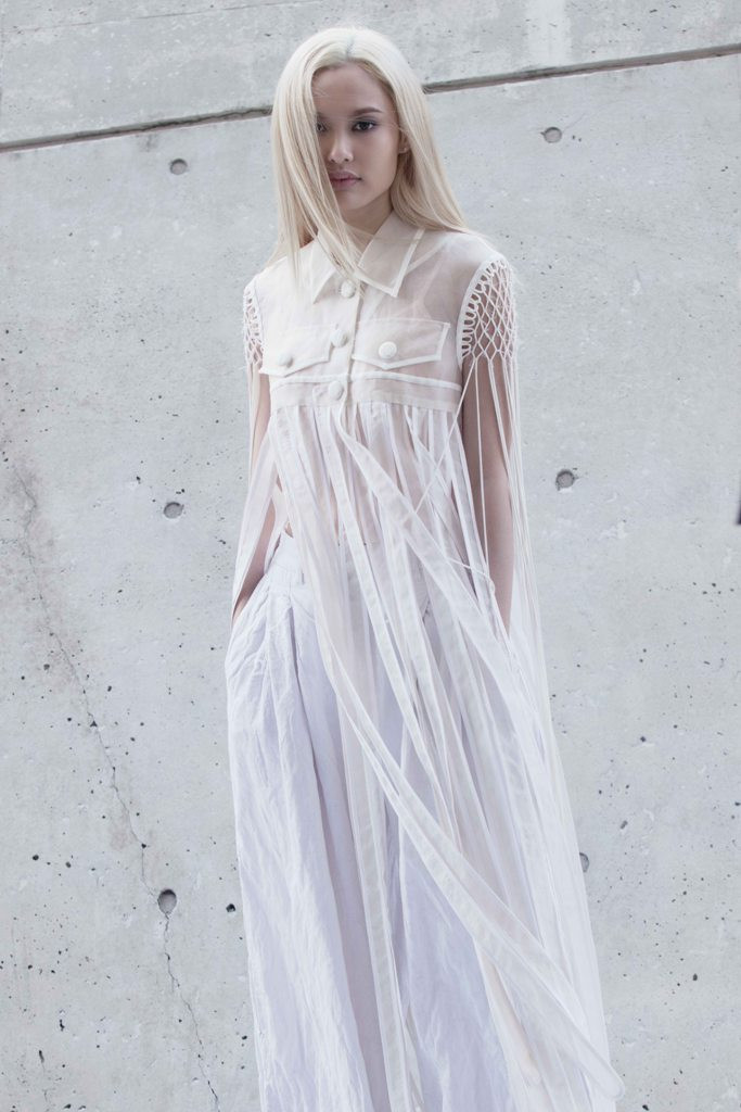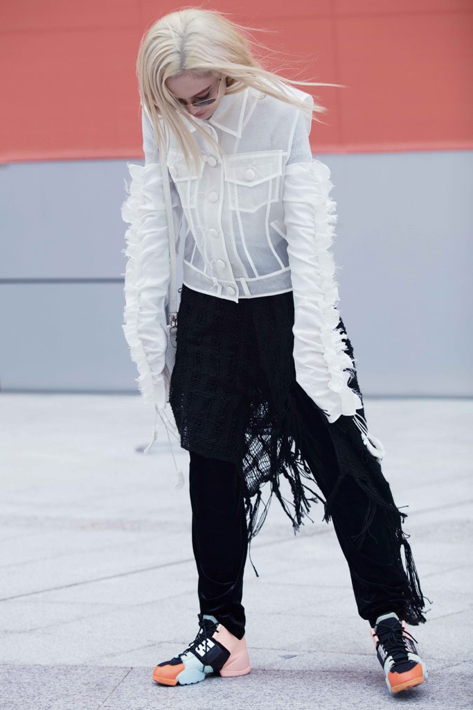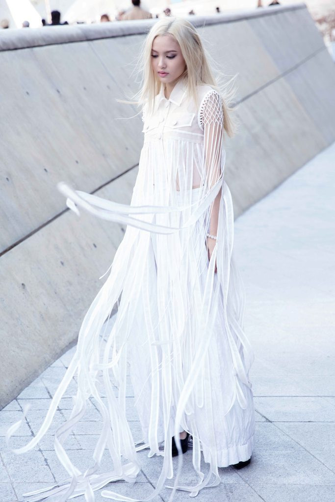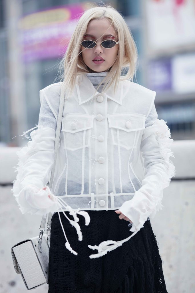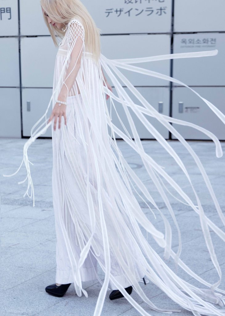 Lựa chọn phong cách all white, Fung La tạo nên vẻ ngoài lạnh lùng, cá tính. Đặc biệt, thiết kế tua rua là xu hướng thời trang của năm 2016 nhưng người đẹp đã "hồi sinh" nó qua cá tính thời trang của chính cô khi xuất hiện tại "sàn đấu" thời trang quốc tế.