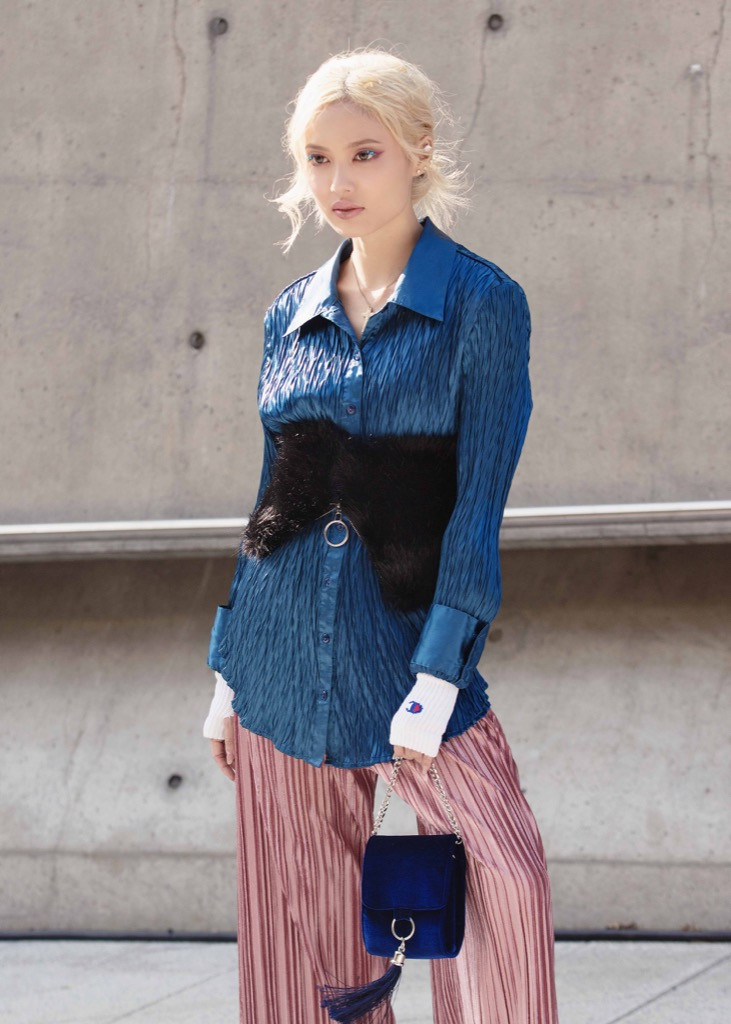 Ở ngày cuối cùng của Seoul Fashion Week 2018, người đẹp lại “gây thương nhớ” bởi cách chơi màu độc đáo khi phối hợp quần xếp li metalic màu hồng pastel cùng áo sơmi xanh coban. Lối trang điểm nhẹ nhàng, tông xuyệt tông với màu quần cũng khiến Fung La thêm phần nữ tính.