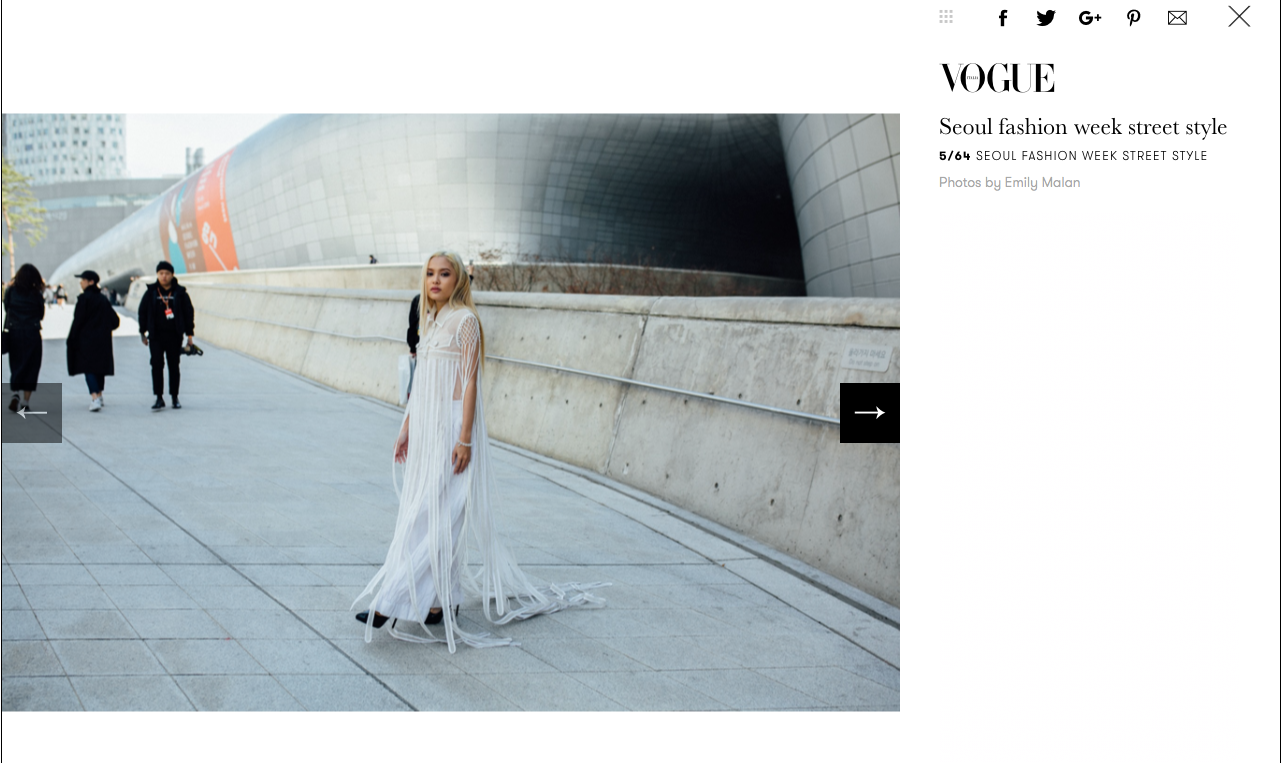 Lựa chọn phong cách all white, Fung La tạo nên vẻ ngoài lạnh lùng, cá tính khi xuất hiện trong một bài viết của tạp chí Vogue. Đặc biệt, thiết kế tua rua là xu hướng thời trang của năm 2016 nhưng người đẹp đã "hồi sinh" nó qua cá tính thời trang của chính cô. Mái tóc vàng bạch kim cùng bộ cánh tua rua màu trắng khiến cô nàng Á quân trở thành một “bạch phát ma nữ” đầy huyền bí trên đường phố Seoul.