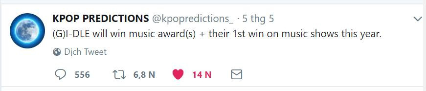 Bên cạnh những lời chúc mừng dành cho tân binh nhà Cube, nhiều cư dân mạng "nổi da gà" khi lật lại những "lời tiên tri" được đăng tải trên trang twitter @kpopredictions. Từ đầu tháng 5, tài khoản này đã dự đoán (G)I-DLE sẽ giành ít nhất một giải thưởng và có chiến thắng đầu tiên vào năm nay. Khi đó nhóm mới ra MV debut được 3 ngày.