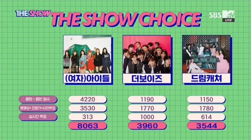Trong chương trình âm nhạc The Show phát sóng tối 22 tháng 5 vừa qua, tân binh nhà Cube (G)I-DLE đã giành chiến thắng đầu tiên trong sự nghiệp. LATATA đã đánh bại hai ứng cử viên khác là Giddy Up (The Boyz) và You and I (DreamCatcher) với số điểm 8063.