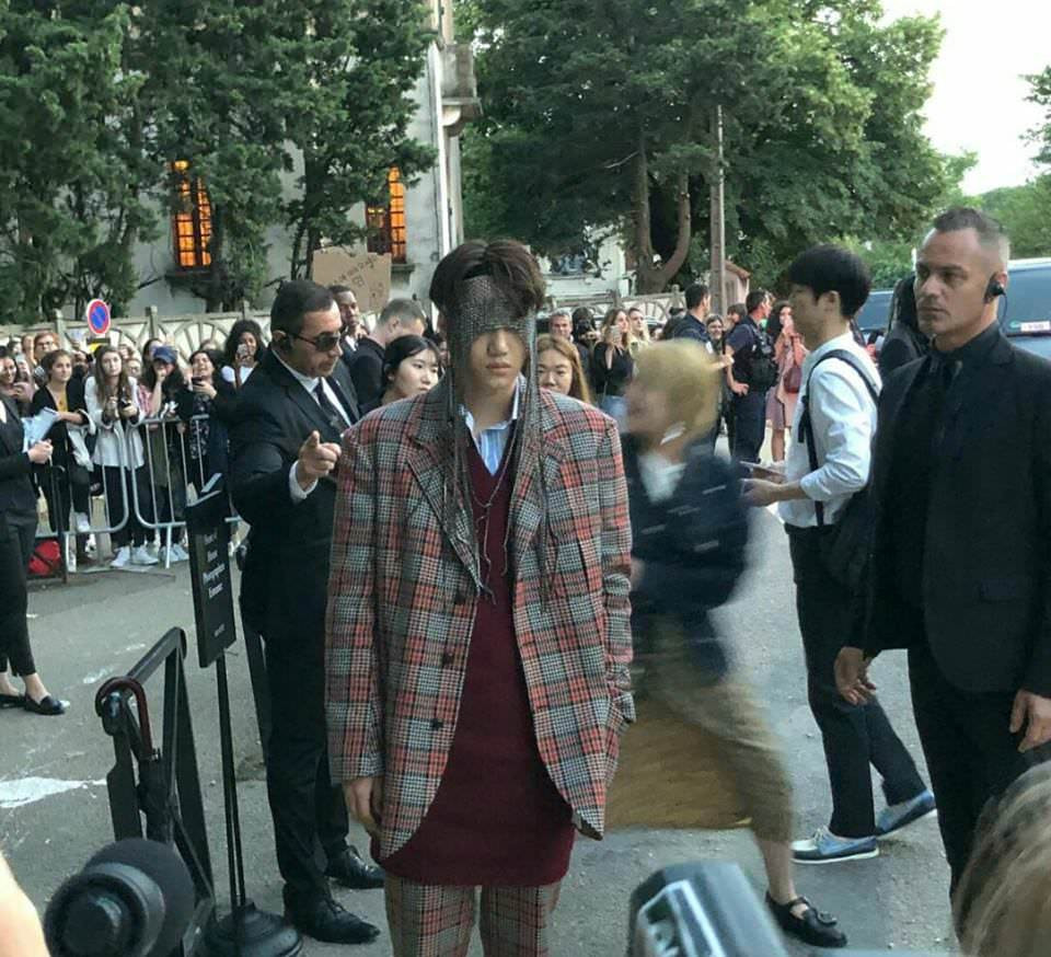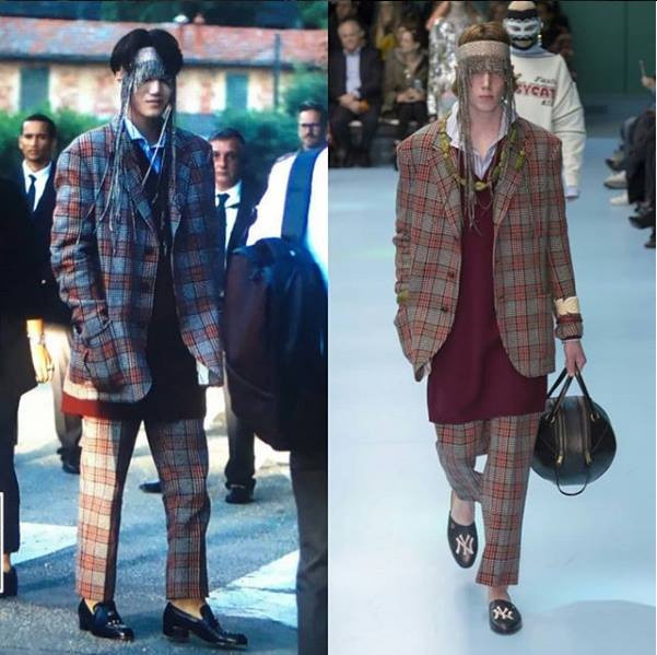 Kai diện gần như là nguyên một set đồ nằm trong bộ sưu tập Gucci Thu Đông 2018 dành riêng cho nam giới. Bản thân bộ vest kẻ đi kèm áo len ôm dài đã rất phá cách, nhưng chiếc “headband rèm cửa” mà Kai đeo mới là điểm nhấn gây xôn xao.