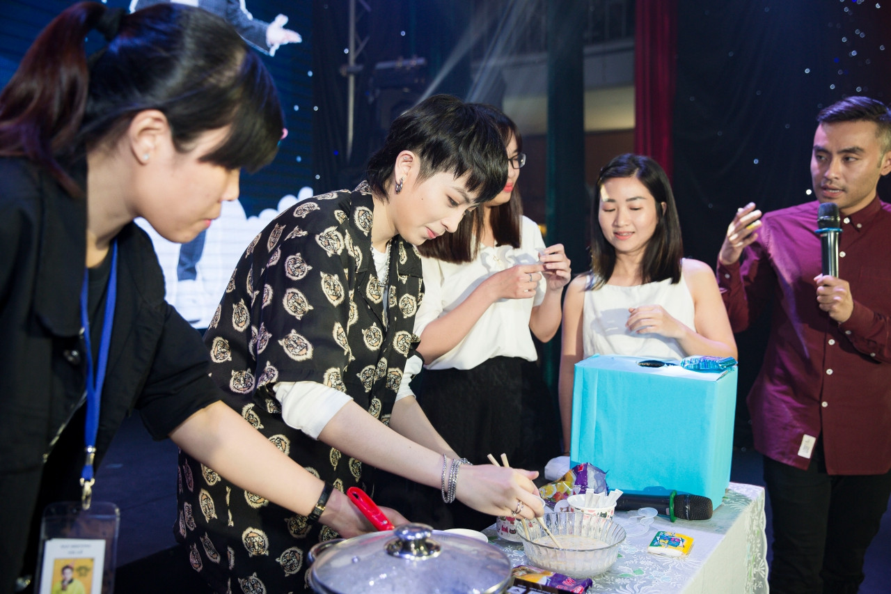 Tại buổi fan meeting, khán giả yêu mến Gil Lê đã đặt ra vô số thử thách có phần “oái oăm” cho thần tượng. Một trong số đó là nữ ca sĩ phải tự tay nấu món ăn yêu thích "mì gói sữa" ngay trên sân khấu. Gil kể, khi còn nhỏ, buổi tối đói bụng, cô đi xuống nhà lục tủ lạnh thì thấy chỉ còn mì gói và sữa nên nghĩ ra cách thay nước sôi bằng sữa tươi để nấu chín mì.