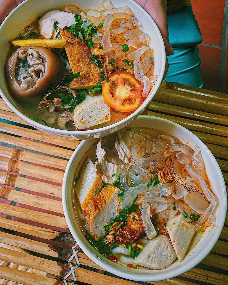 Phủ phê đồ ăn - Ảnh: Sam Nguyễn Tô bún cá loại đặc biệt của má Tư cực nhiều đồ ăn: Chả cá thu hấp và chiên, dai dai, giòn ngọt; cá ngừ luộc nên còn giữ được vị ngọt thanh tự nhiên; sứa giòn sừn sựt; bao tử cá chiên beo béo và giò heo thịt ngập răng. Đồ ăn được má Tư lựa tươi roi rói mỗi ngày, nước dùng trong và ngọt thanh, nước chấm lại pha khéo. Cả tô bún trọn vị khó chê được điểm nào.