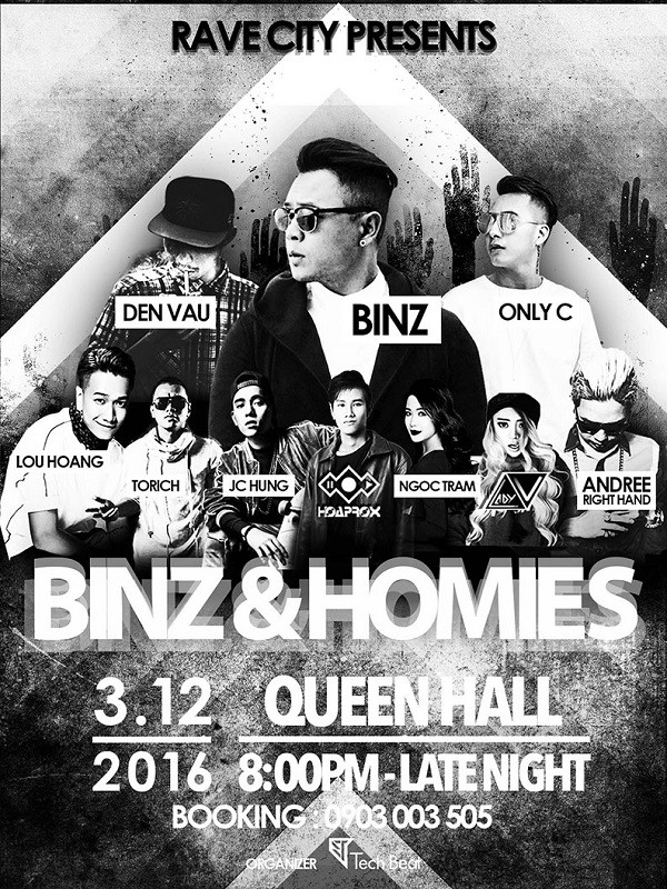 Vậy là vào ngày 03/12 tới đây tại Queen Hall – số 5 Nguyễn Tất Thành, Quận 4, Tp.HCM sẽ diễn ra đại nhạc hội nhạc RAP “có 1 không 2”. Sự kiện quy tụ những tên tuổi đình đám nhất trong giới rapper và âm nhạc điện tử Việt Nam như: Binz, Đen Vâu, Only C, Andree Right Hand, Lou Hoàng, Hoaprox, Ngọc Trâm (Giọng Hát Việt 2013), Lady V, JC Hung, MC Torich.