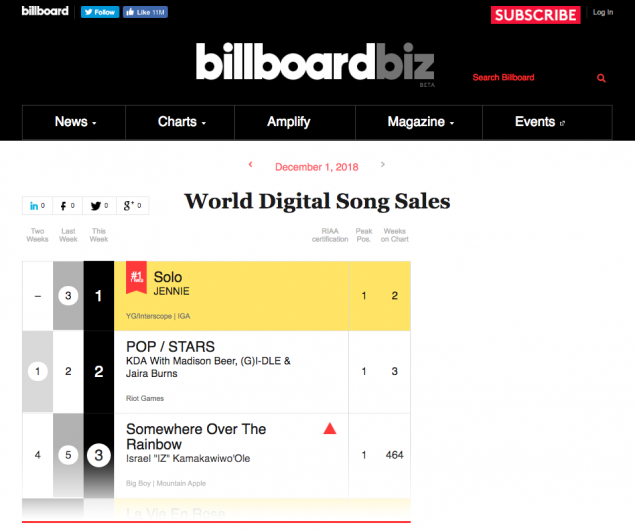 Single đầu tay của Jennie SOLO đứng vị trí số 1 ngay tuần đầu debut trên World Digital Song Sales của Billboard, vượt qua Pop/Stars của K/DA. Trước đó, BLACKPINK cũng 5 lần đứng đầu BXH này với BOOMBAYAH, Playing With Fire, As If It's Your Last và DDU-DU DDU-DU.