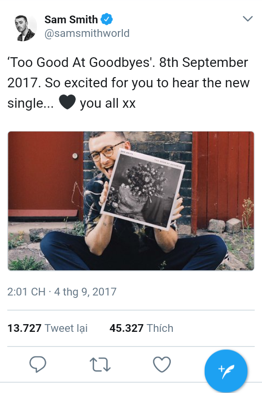 Những ngày vừa qua, các trang mạng xã hội của Sam Smith bỗng nhiên “xôm” hơn hẳn. Nguyên nhân là vì Sam đã bất ngờ “thả thính” với các fan thông tin về một single mới toanh sắp ra mắt - Too Good At Goodbyes. Single này sẽ chính thức xuất xưởng vào thứ Sáu ngày 8/9, tức là chỉ còn chưa đến hai ngày nữa thôi, yeahh!!!