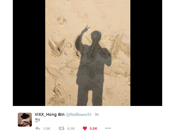 “JJan!” HongBin rất phấn khích khi VIXX đã đặt chân đến bãi biển Đà Nẵng. Anh chàng “đánh dấu” bằng cách viết tên nhóm lên cát và không quên chụp kèm cái bóng của mình vào.