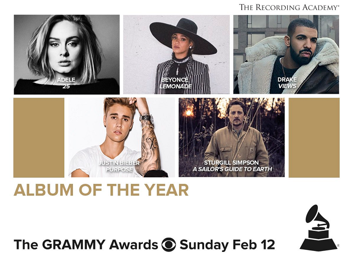 Ở hạng mục Album of the year (Album của năm), 25 - Adele và Lemonade - Beyoncé tiếp tục là hai ứng viên sáng giá. Ngoài ra, album Views của Drake, Purpose của Justin Bieber, A Sailor's Guide To Earth của Sturgill Simpson cũng là những ứng cử viên nặng ký cho giải thưởng lớn này.