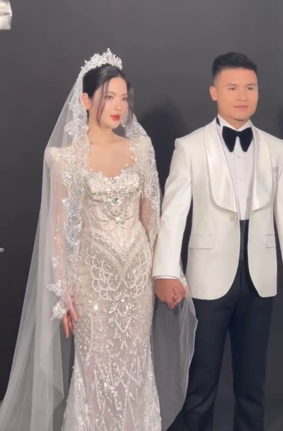 Có thể thấy cô dâu của Quang Hải rất chuộng thiết kế đuôi cá khoe khéo vóc dáng, được đính kết pha lê lấp lánh cầu kỳ mang đậm phong cách sang chảnh. Chu Thanh Huyền còn kết hợp thêm vương miện đi kèm khăn voan thêu họa tiết để mang lại diện mạo lộng lẫy như công chúa.