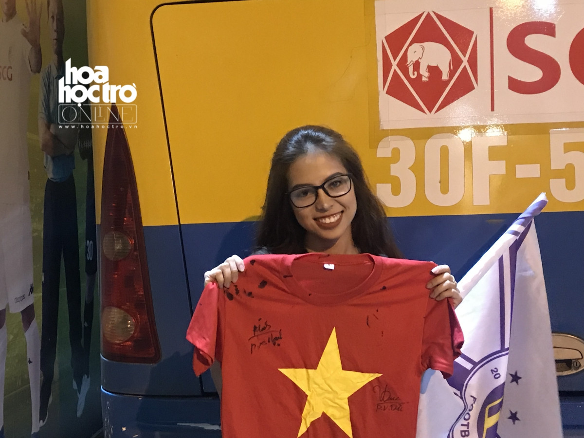 Cô bạn Hoàng Bích Diệp (Hà Nội) đứng chờ sẵn xe ô tô chở các cầu thủ để xin chữ kí của "dàn sao" U23 Việt Nam.