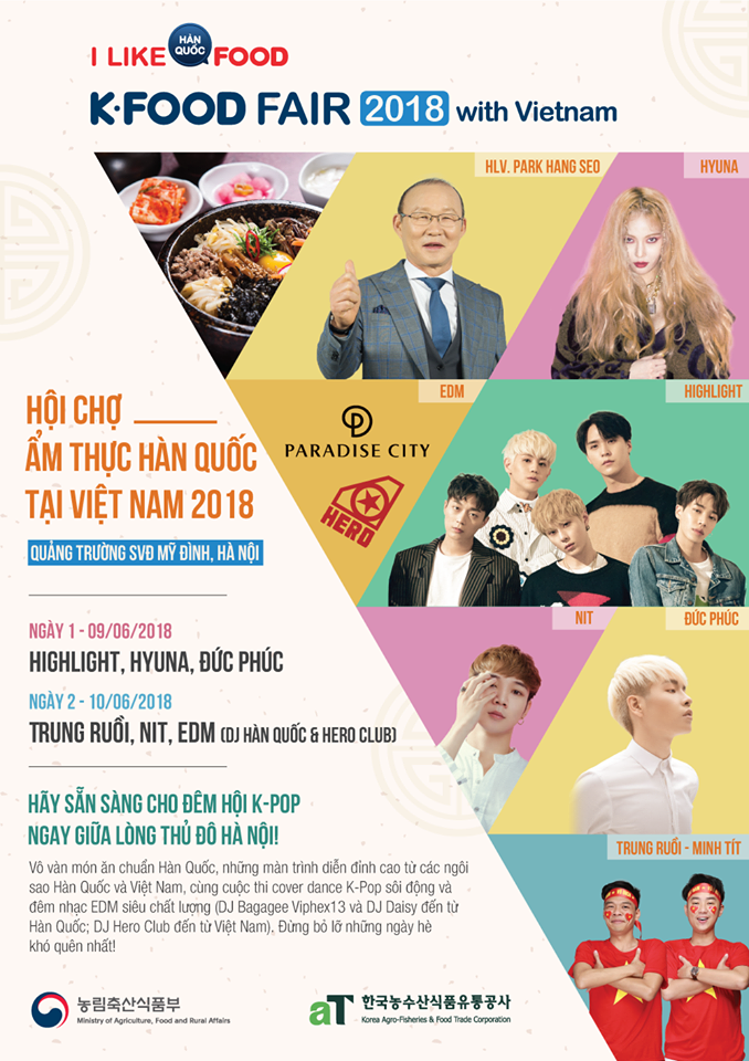 Nằm trong các hoạt động thúc đẩy thương mại và giao lưu văn hóa xã hội giữa hai quốc gia, Tổng công ty Phân phối Nông thủy sản và thực phẩm Hàn Quốc aT phối hợp với Bộ Nông nghiệp và Thực phẩm Hàn Quốc tổ chức Hội chợ ẩm thực Hàn Quốc tại Hà Nội năm 2018 (2018 HANOI K-FOOD FAIR) trong hai ngày 9 và 10 tháng 6 tại Quảng trường SVĐ Mỹ Đình. Vé vào cửa hoàn toàn miễn phí.