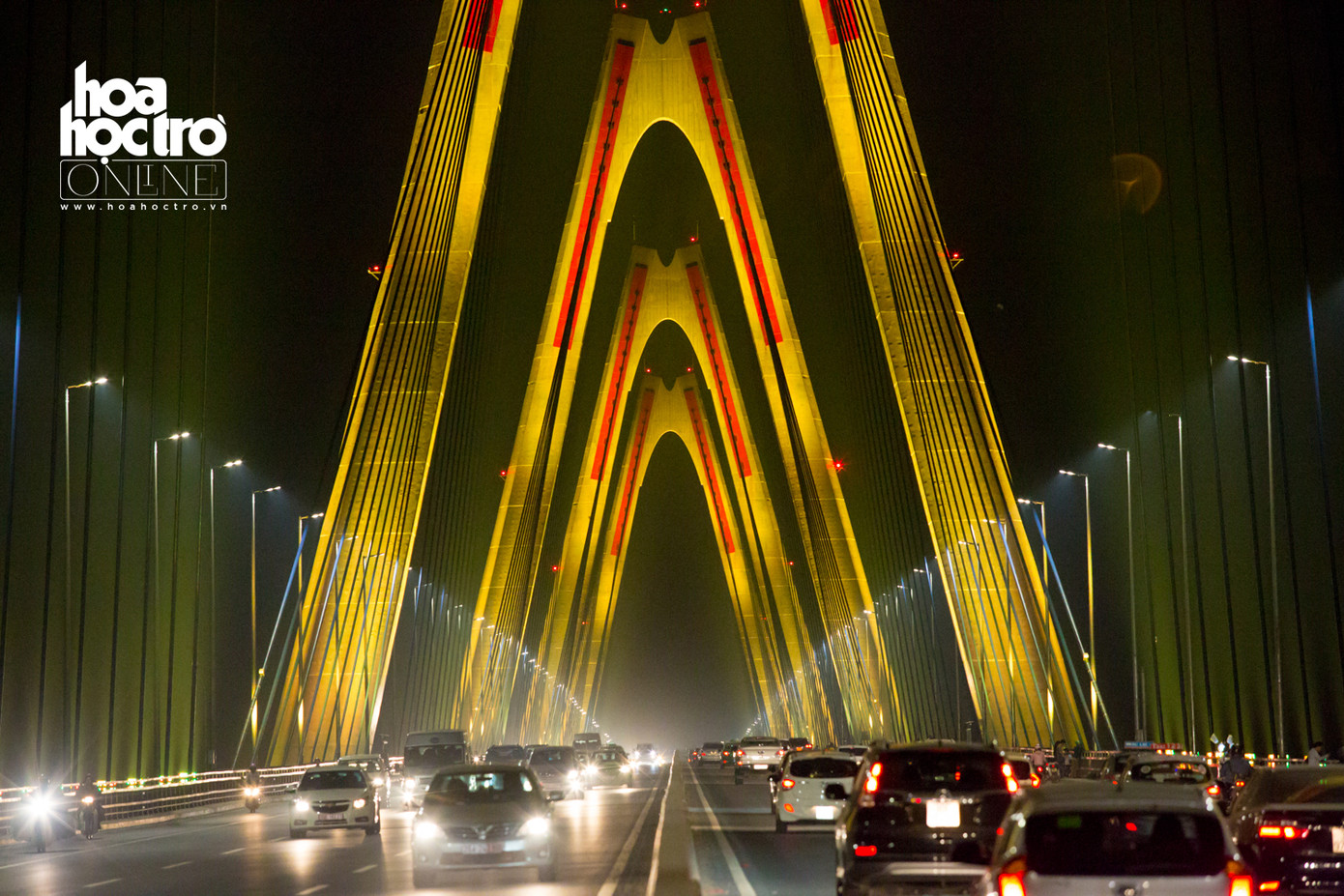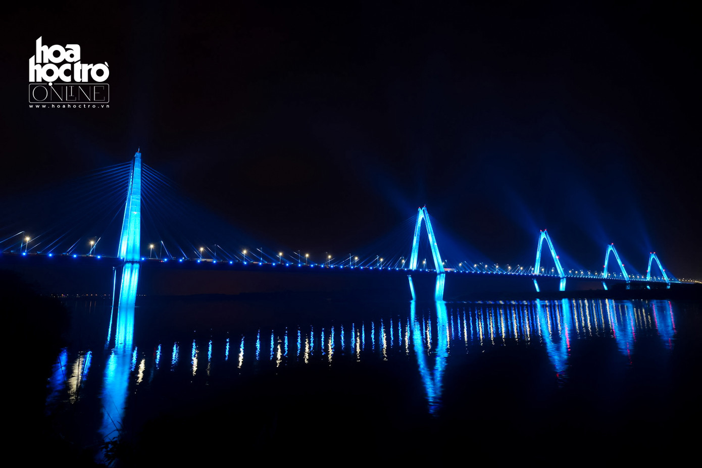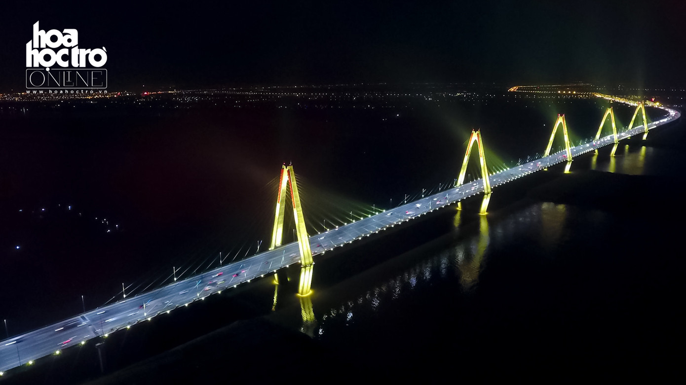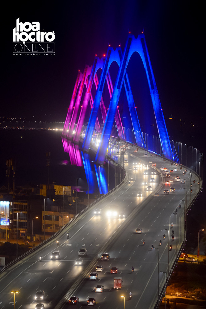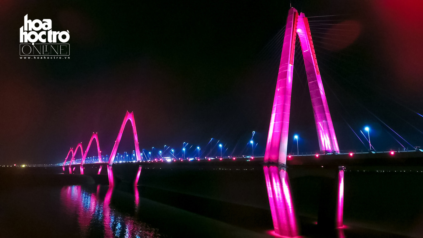 Tối 28/4, hệ thống chiếu sáng dài 3.755 mét, tạo ánh sáng mỹ thuật cho dây văng và hai bên thành cầu Nhật Tân đã được khánh thành.
