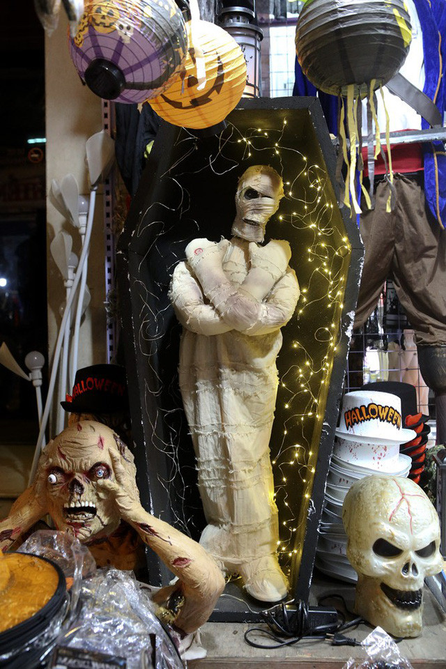 Halloween có nguồn gốc từ phương Tây rồi du nhập về Việt Nam. Một vài năm trước, lễ hội này còn khá xa lạ thì nay đã là một dịp được quan tâm của giới trẻ. Trong ảnh là một hình xác ướp nằm trong quan tài trông rất thật, được bày bán trên phố Hàng Mã.