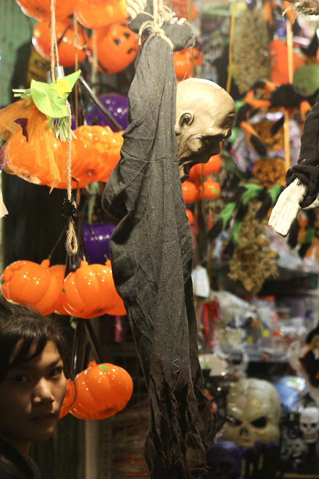 Những bóng ma trên đường phố. Những thứ không thể thiếu trong lễ hội Halloween đó là: Bí ngô, phù thủy, ma cà rồng, zombie. Một sản phẩm là hình người chết bị treo lên cây bán khá chạy.