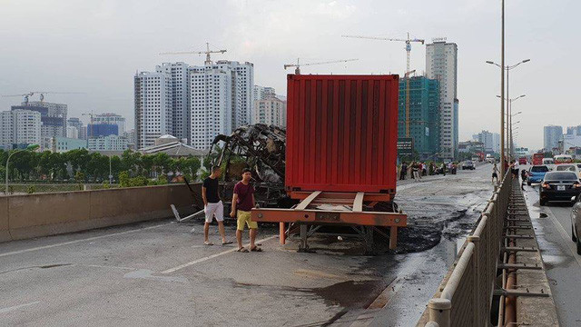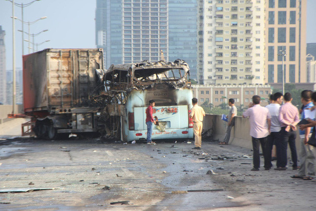Theo thông tin ban đầu, vào khoảng 4h45 sáng nay, một chiếc xe khách loại 47 chỗ BKS 37B-018.42 chạy trên đường trên cao theo hướng cầu Thanh Trì - bến xe Mỹ Đình, đến khu vực đường Khuất Duy Tiến thì đâm vào đuôi xe container 34C-193.15 kéo theo rơ-moóc. Sau cú va chạm mạnh, cả 2 xe bốc cháy, 1 người phụ nữ tử vong.