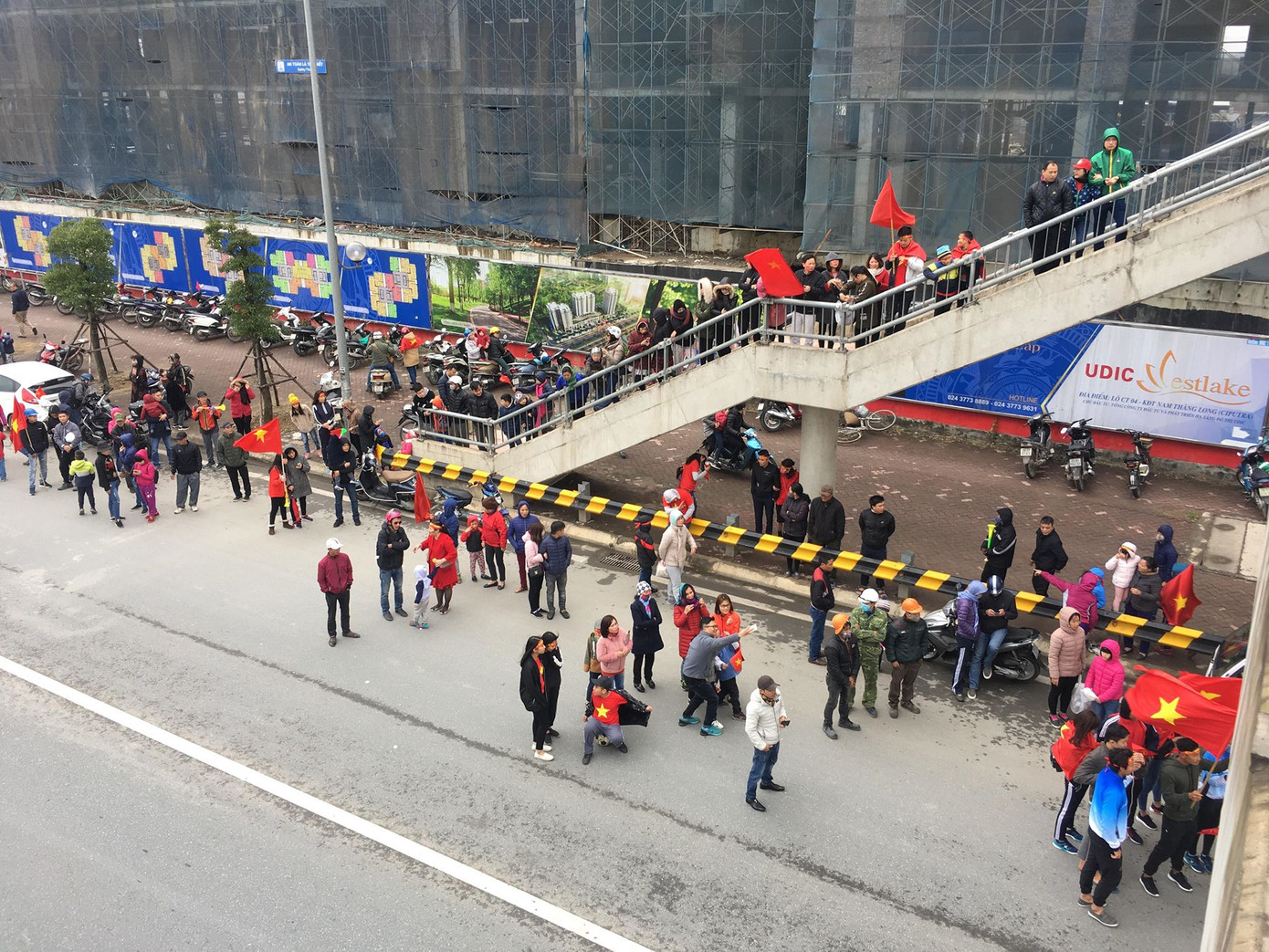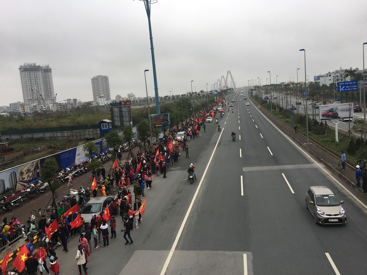 Từ khoảng 12h trưa, rất nhiều người dân đã tập trung ở khu vực cầu Nhật Tân, nơi xe buýt 2 tầng chở các cầu thủ U23 sẽ diễu hành qua để đón các "người hùng" trở về.
