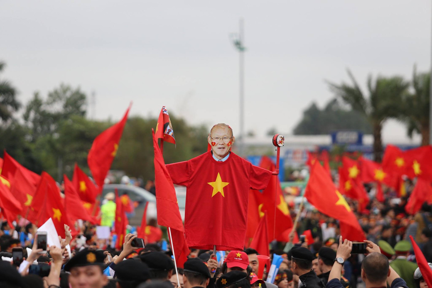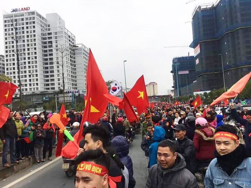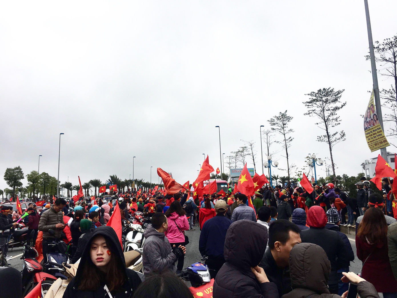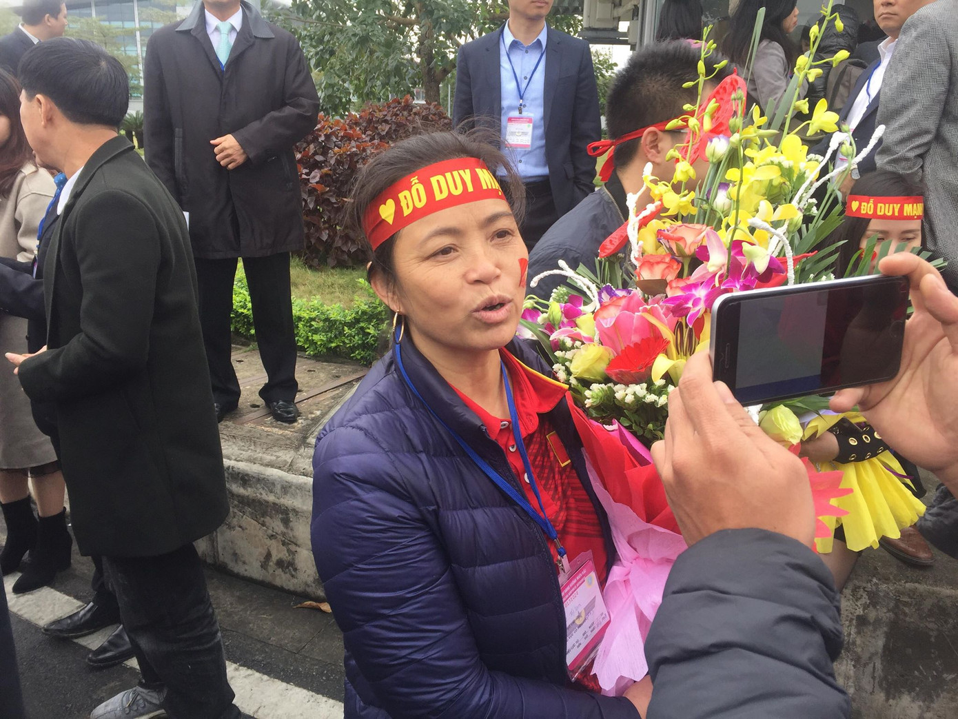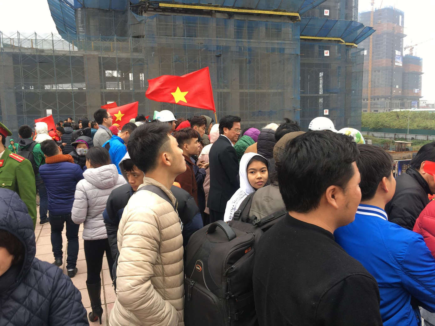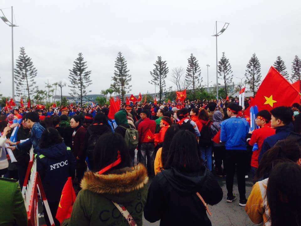 Nhiều người cầm theo cờ Tổ quốc, đeo băng-rôn chúc mừng các tuyển thủ về nước.