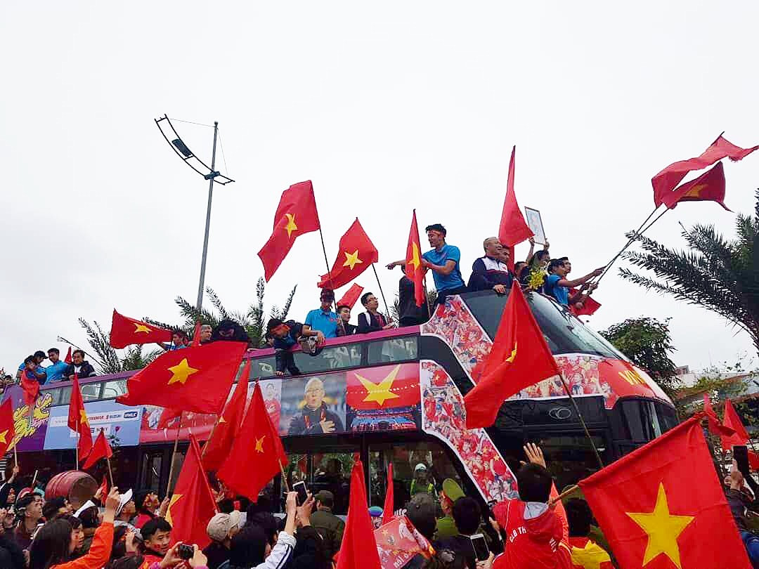 Các cầu thủ trên xe bus 2 tầng diễu hành từ Sân bay Nội Bài về trung tâm Hà Nội. (Ảnh: Anh Đức Nguyễn)