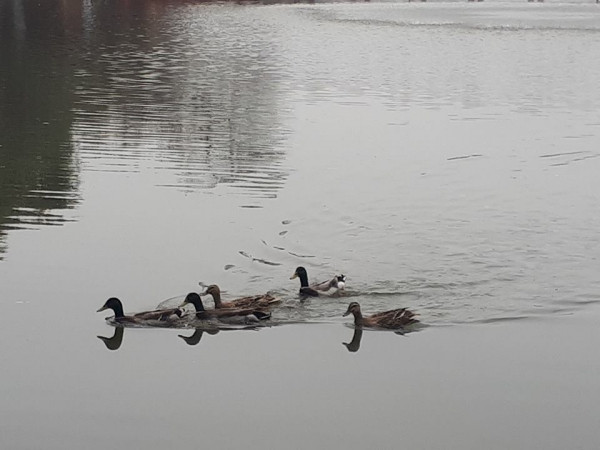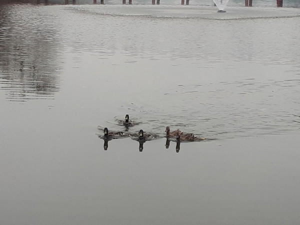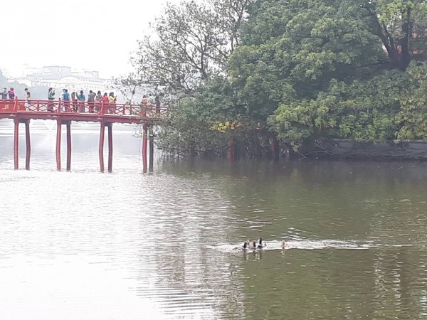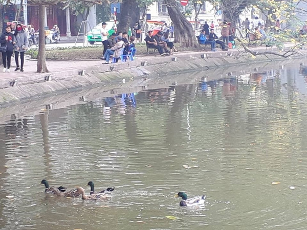Chiều 28/2, nhiều du khách và người dân đi qua Hồ Gươm, quận Hoàn Kiếm, Hà Nội bất ngờ khi thấy sự xuất hiện của một đàn vịt bơi tung tăng dưới mặt nước.
