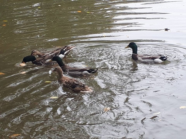 Đàn vịt vô tư ăn thức ăn mọi người ném xuống và không sợ hãi trước người lạ.