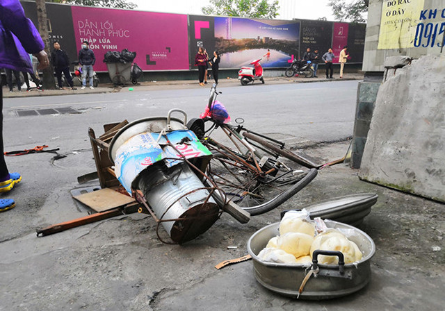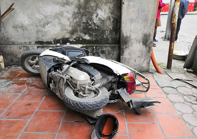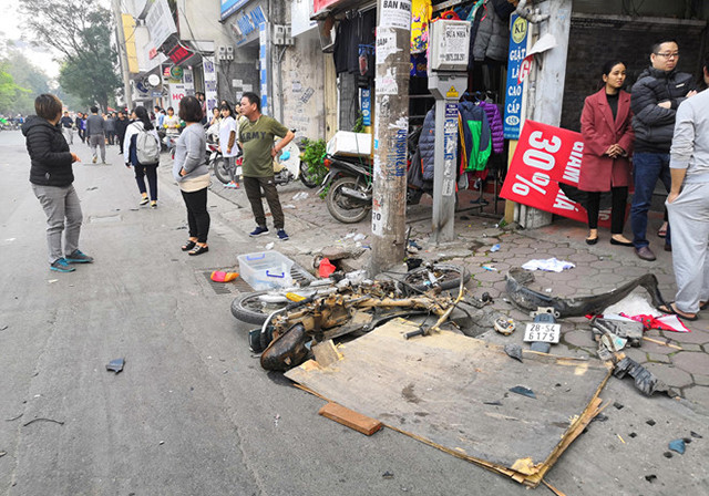 Tại hiện trường, các phương tiện đổ rạp do va chạm, trong đó ba xe máy vỡ vụn, hư hỏng nặng. Mảnh vỡ văng tung tóe khắp mặt đường phố Ngọc Khánh.