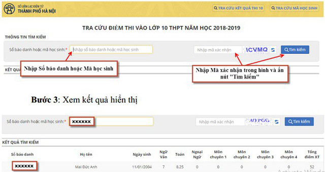 Cách 1, tra cứu trực tiếp bằng số báo danh hoặc mã học sinh.