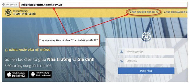 Bước 1: Truy cập trang web: www.solienlacdientu.hanoi.gov.vn và chọn “TRA CỨU KẾT QUẢ THI 10”: