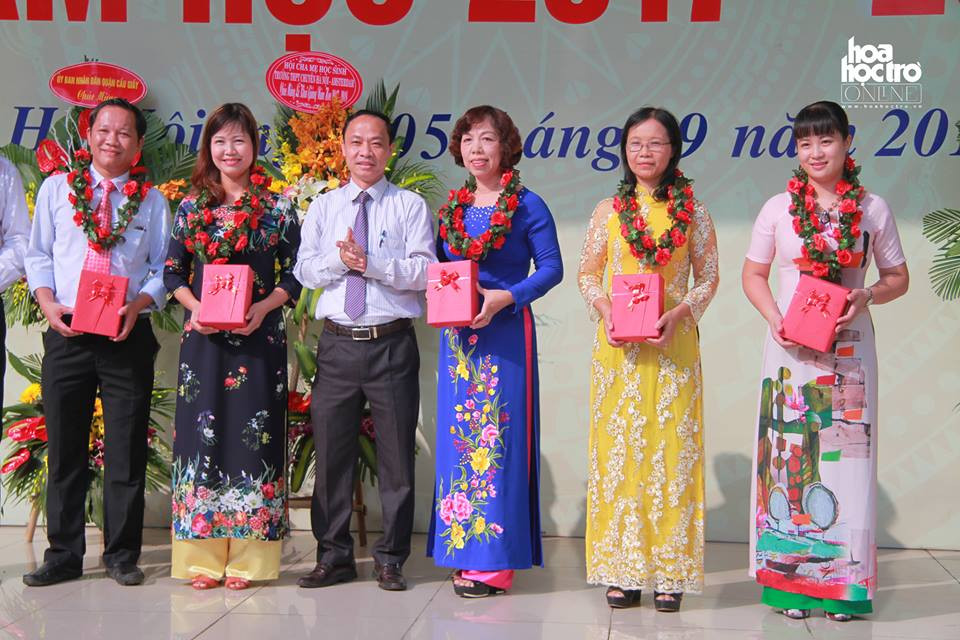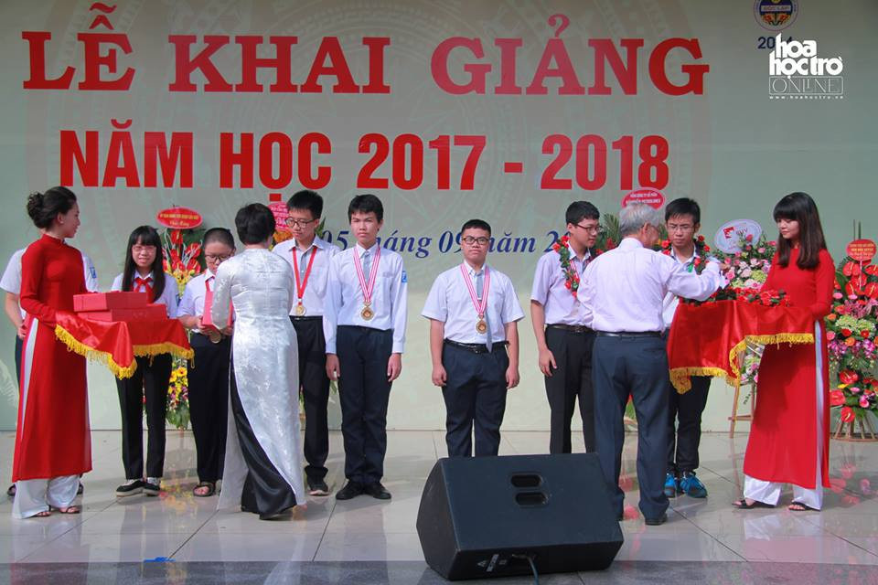 Cô Lê Thị Oanh - Hiệu trưởng nhà trường và thầy Nguyễn Kim Hoãn - nguyên Hiệu trưởng đầu tiên của trường THPT chuyên Hà Nội - Amsterdam lên trao thưởng cho các bạn học sinh suất sắc trong kì thi Olympic Toán quốc tế.