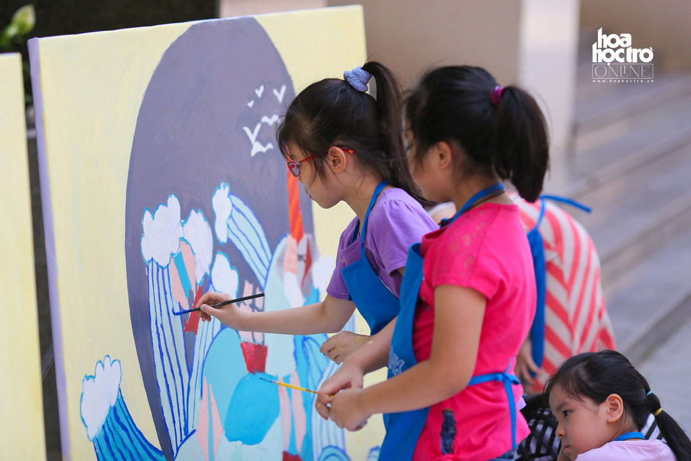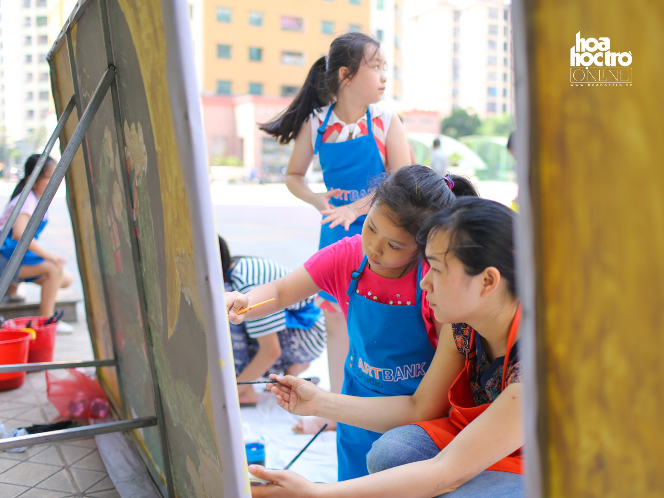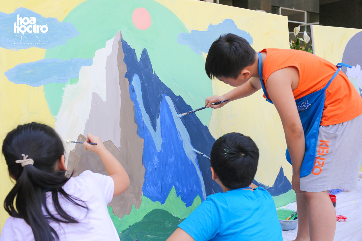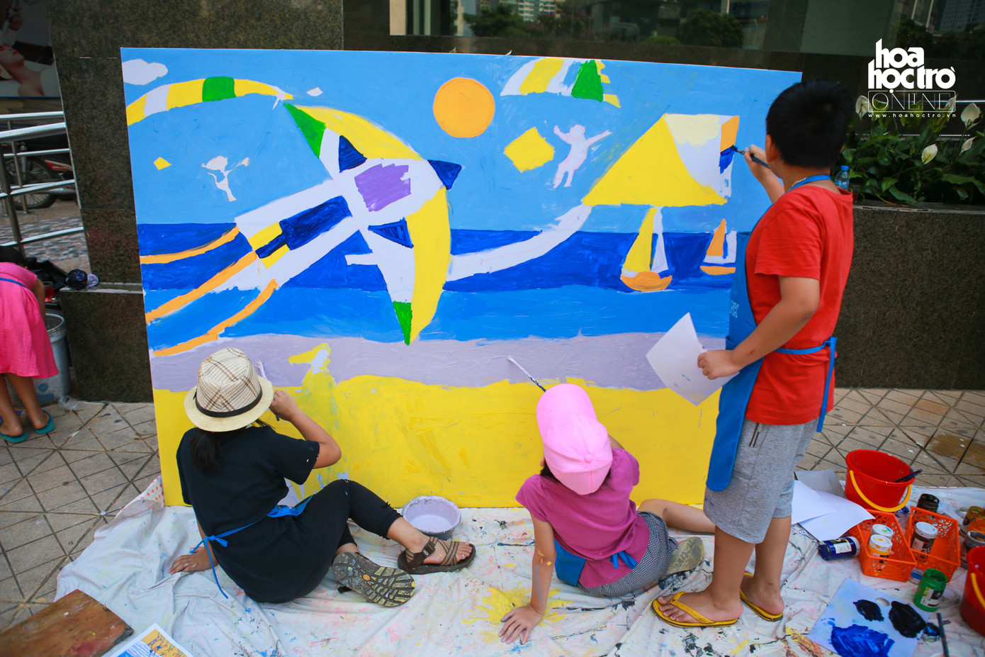 Nhằm tạo ra một sân chơi bổ ích cho các bé đang nghỉ Hè, một lớp học hội họa đã cùng với gần 20 bạn nhỏ đóng vai học sĩ để vẽ nên những bức tranh khổng lồ.